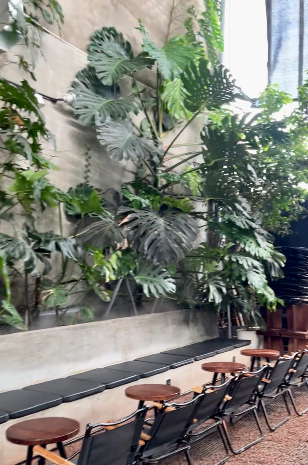 This unusual cafe looks like a warehouse from the outside, but opens up into a large space absolutely overflowing with tropical plants.